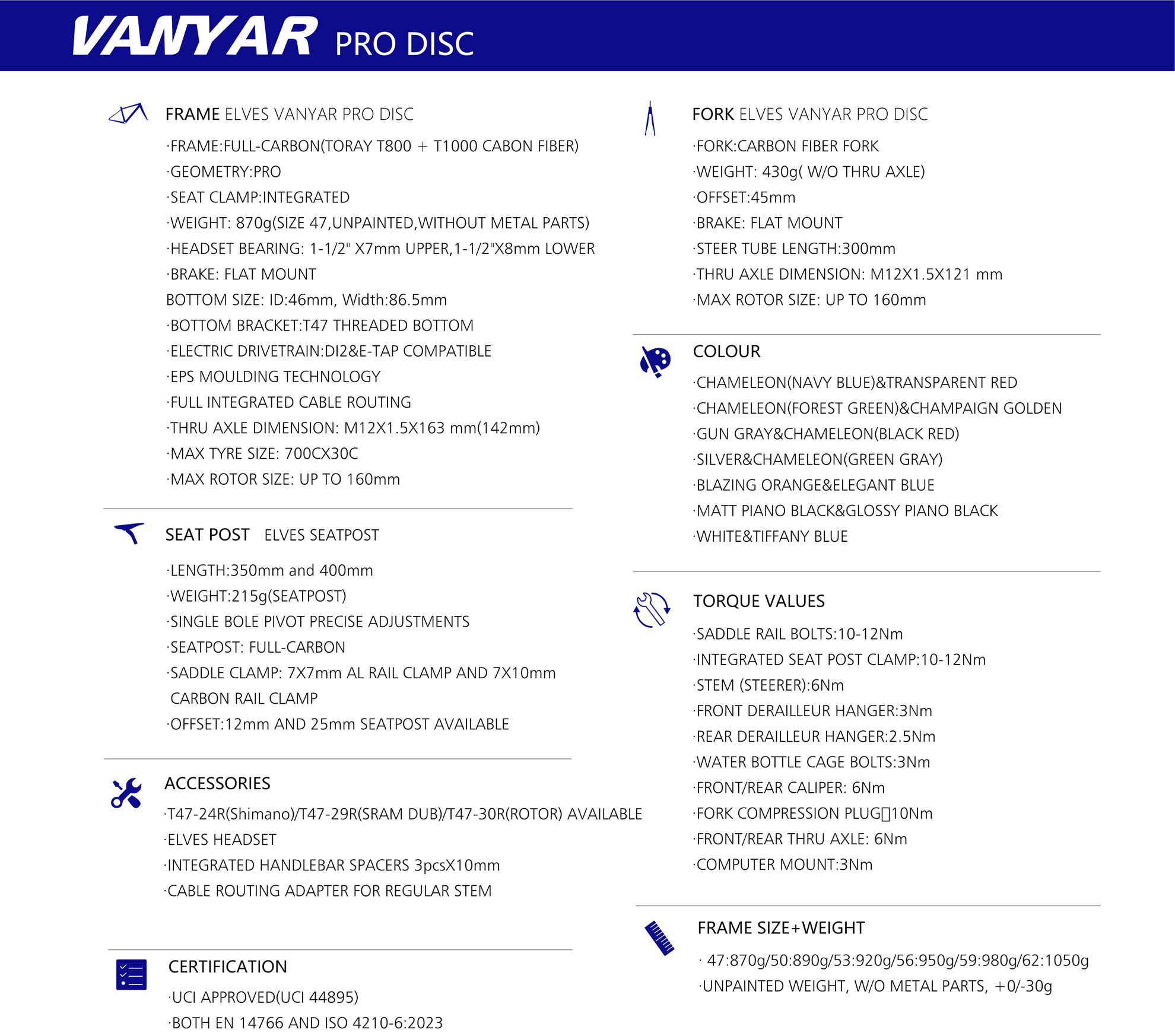 To support Elves Bikes exponential global growth and movement into the western markets, the Vanyar Pro UCI Disc 2024 is available in the following frame sizes; 47cm, 50cm, 53cm, 56cm, 59cm, 62cm. Please refer to the detailed geometry provided to gain further insight.